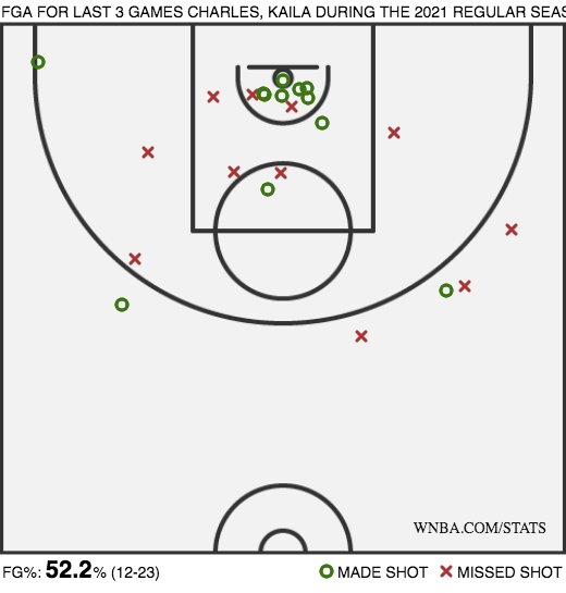 Only shooting 34.9 percent overall this season, that mark has risen to 52.2 percent over the last three games. Here’s her shot chart if we look just at this current run: