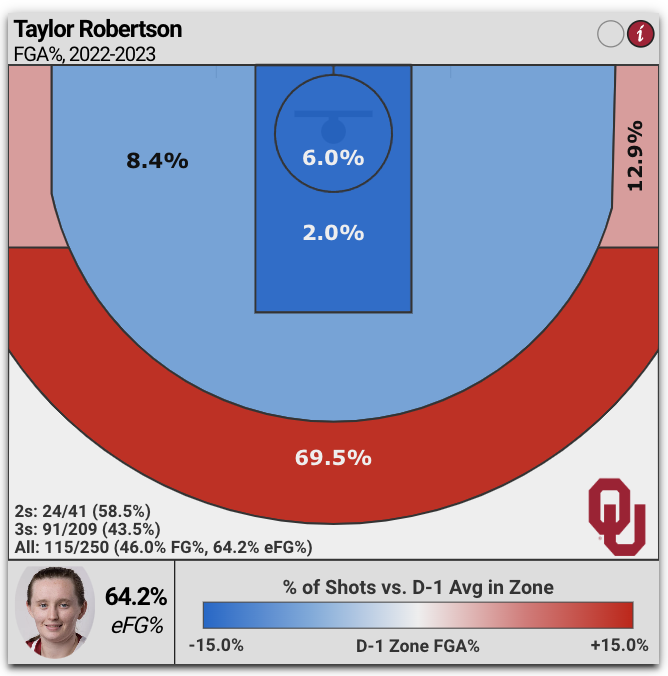 She finished her career shooting an impressive 44 percent from three, along with being the Big 12 and Oklahoma career three-point record holder. Per CBB analytics, as shown in the table below, 69.5 percent of Robertson’s shots this year were above-the-break threes. For context, the NCAAW average is 25 percent from that range.