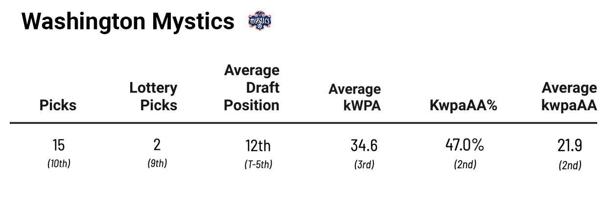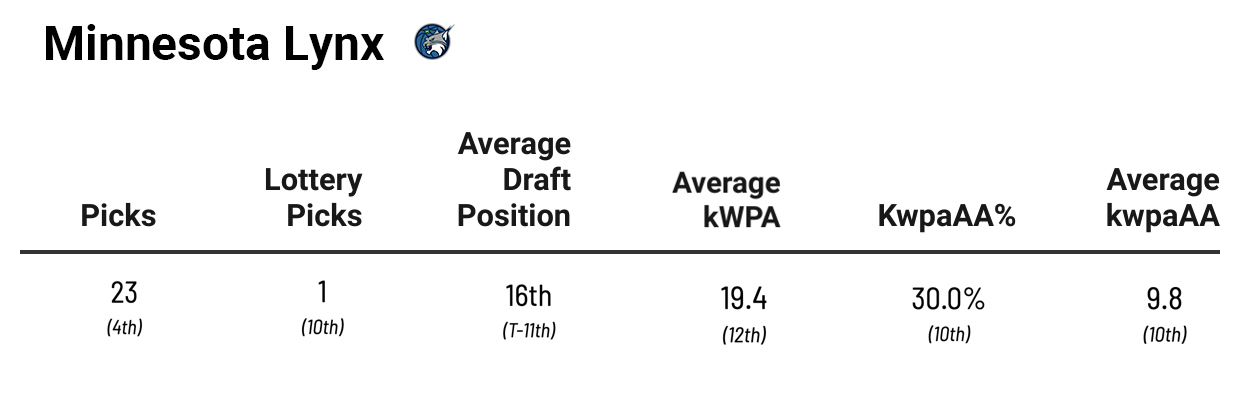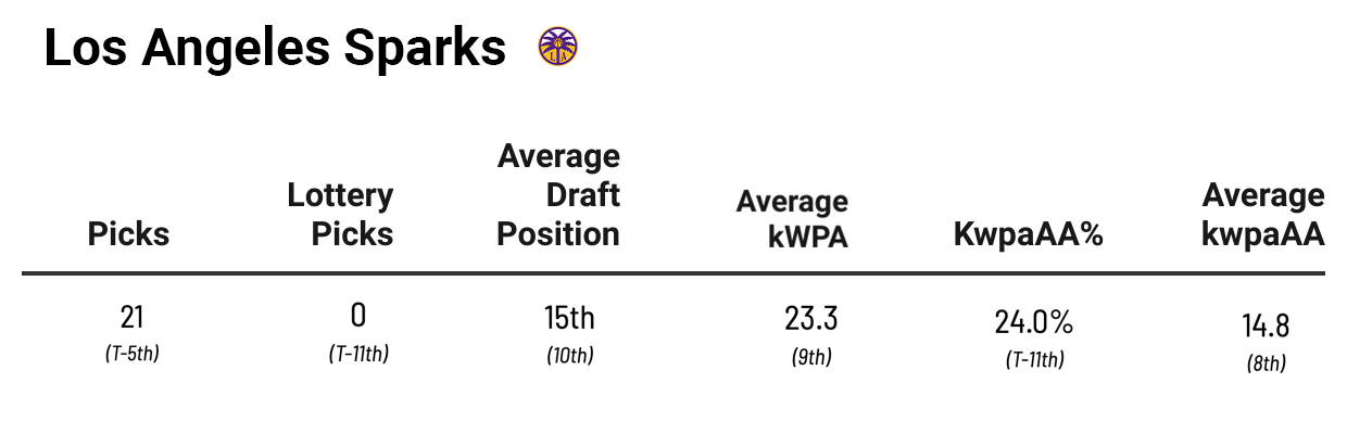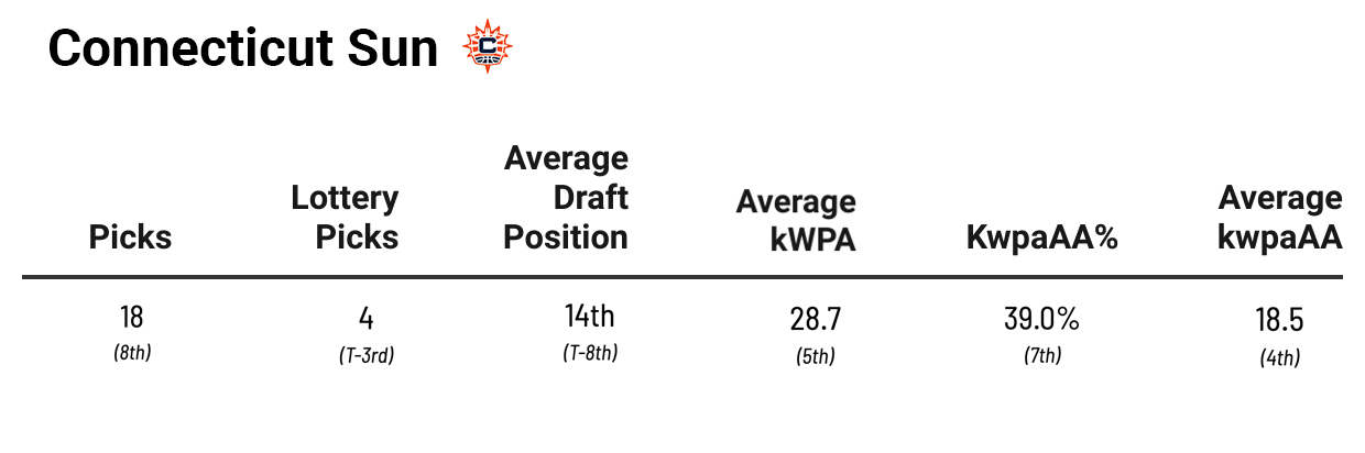 The Fever are only eighth in average kwpaAA, which shows this is a team that’s more quantity than quality when it comes to drafting. Considering the amount of picks they’ve had, the 46.0 percent kwpaAA% isn’t too shocking. And the Fever have 2023 first-overall pick Aliyah Boston, 2022 second-overall pick NaLyssa Smith, and 2023 seventh-overall pick Grace Berger as players who are likely to become positive kpwaAA players soon. However, you can’t get a ton of credit for drafting the player you’re supposed to draft, and the players that have positive value aren’t exceeding it by that much (only eighth as a team in that department).