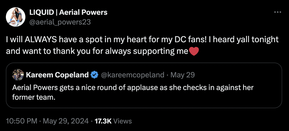 AP was a big fan favorite in Washington. When the Dream faced the Mystics in the Nation’s Capital earlier this season, she received a huge ovation from the Mystic faithful.