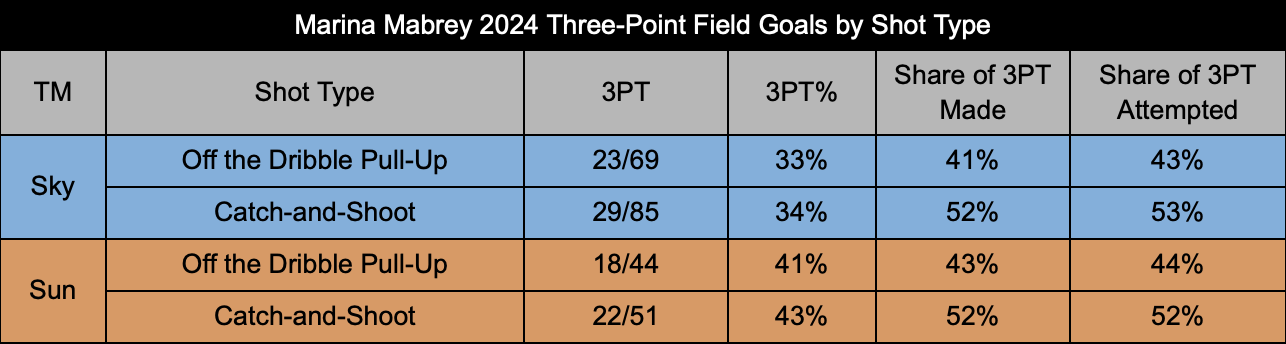 While you might expect Mabrey’s 2024 production differences to be explained by a handful of obvious factors, her challenging first half with Chicago isn’t quite so simple to pin down. Take, for example, the types of shots she took over the course of the season. In a ball-dominant, first-option role with the Sky, you’d probably expect an increase in the share of Mabrey’s three-point attempts that are self-created pull-ups. A player with her ball-handling and stepback skills will always create more off-the-dribble threes compared to catch-and-shoot specialists—but with the perimeter offense flowing through her, that number should be even higher, right? Conversely, the move to Connecticut would presumably lead to more catch-and-shoot threes. You might also assume Mabrey’s improved efficiency with the Sun is due mainly to a higher volume of catch-and-shoot opportunities. Instead, the numbers tell a very different story: