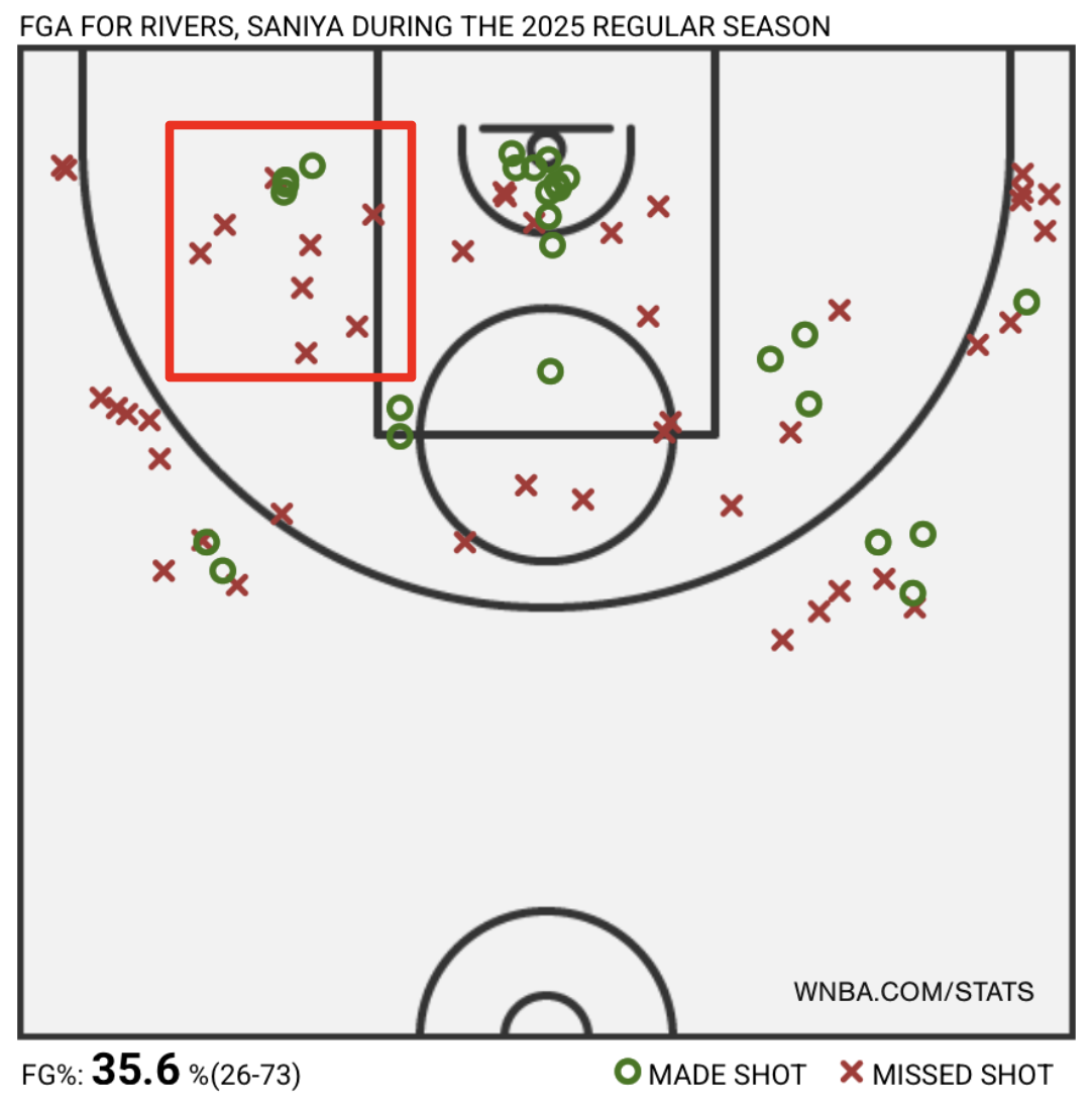 Now, let’s not get ahead of ourselves and mistake rhythm for results. The shot plot shows more misses than makes from that baseline area—meaning the rhythm Rivers displays would be meaningless if it doesn’t eventually lead to efficiency. But Connecticut doesn’t need to stress about the long-term consequences of short-term results this season. Under new head coach Rachid Meziane, who said at media day that “everybody here [in Connecticut]is on the same page, we want to rebuild,” the franchise has shown clear organizational alignment around a patient, development-focused approach in 2025.