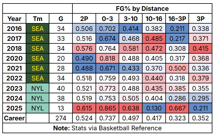So much of her scoring has come within the context of the offense, as Stewart has been assisted on 78.4 percent of her makes, the best mark across her three-year Liberty tenure. Per Basketball Reference, her average shot distance is just 11.0 feet from the basket, far below her career average of 12.8 feet and another career-low (and career-best). While Stewart has continued to struggle from three—a worrisome trend dating back to late in the 2023 season—she’s taking fewer threes than ever before. Through 13 games, Stewart is launching just 2.9 threes a night, one full attempt short of her previous career low, and significantly below her career per-game average of 4.6 threes.